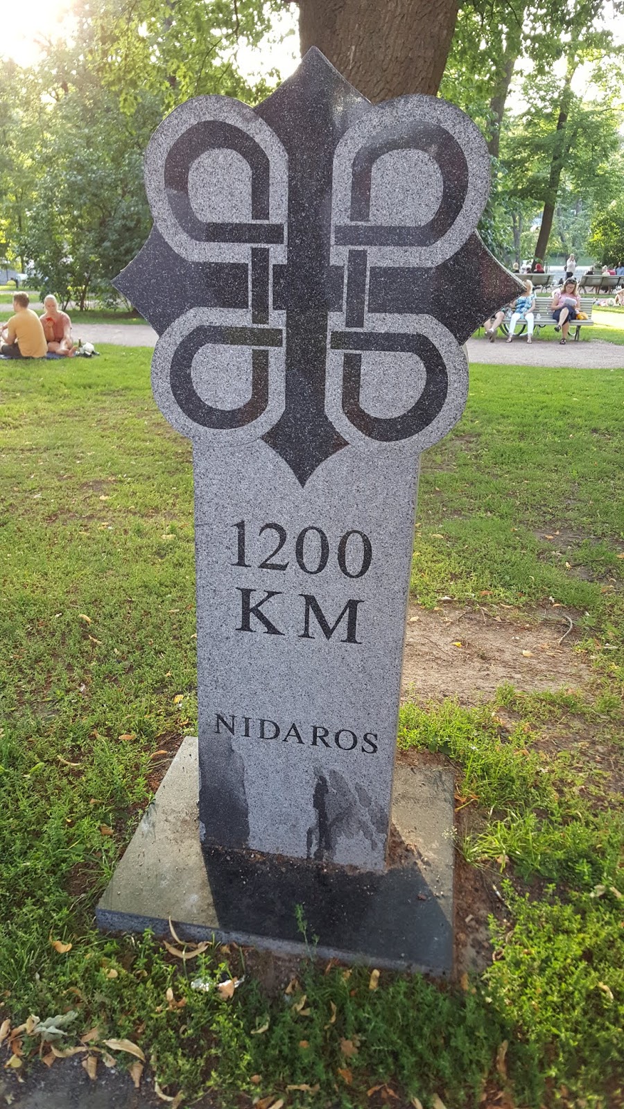 Saimme pyhiinvaelluspassit ja kirkosta lähtiessämme niihin ensimmäisen leiman. Meillä taisi olla tyttäreni kanssa vähän käynnistymisvaikeuksia, sillä muut ryhmästämme olivat jo asettuneet lähtövalmiiksi ristin perään, kun me vasta laskeuduimme kirkon portaita. Minun piti tietysti vielä pysähtyä ottamaan kuviakin. Emme olleet kovin tarkkasilmäisiä perjantai-iltana, sillä Jaakontien simpukkaopaste löytyi vain muutaman metrin päästä Nidarosin kilometripylväästä. Simpukkaopasteen alla oli myös Pyhän Olavin reitin opaste vastakkaiseen suuntaan.